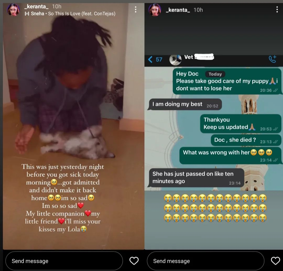 Keranta shared photos of her dog Lola revealing that she died while undergoing treatment hours after falling sick.